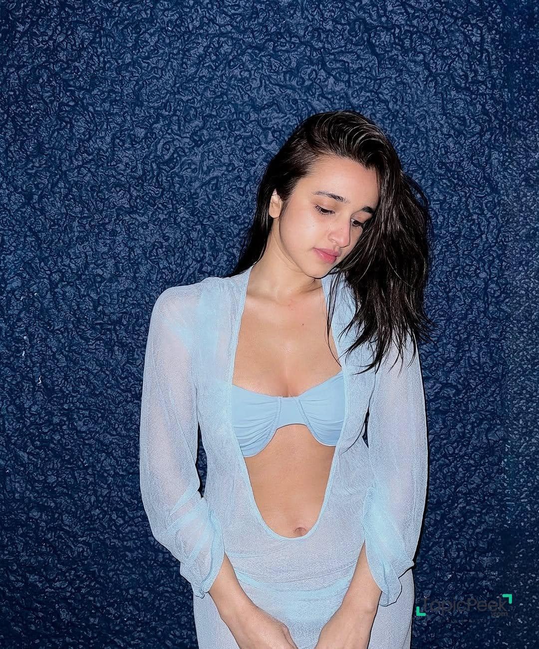 Nuveksha showcases timeless charm in a light blue sheer outfit layered over a matching bikini top. The airy fabric, coordinated color palette, and elegant silhouette make this a standout visual story with strong exotic fashion appeal.